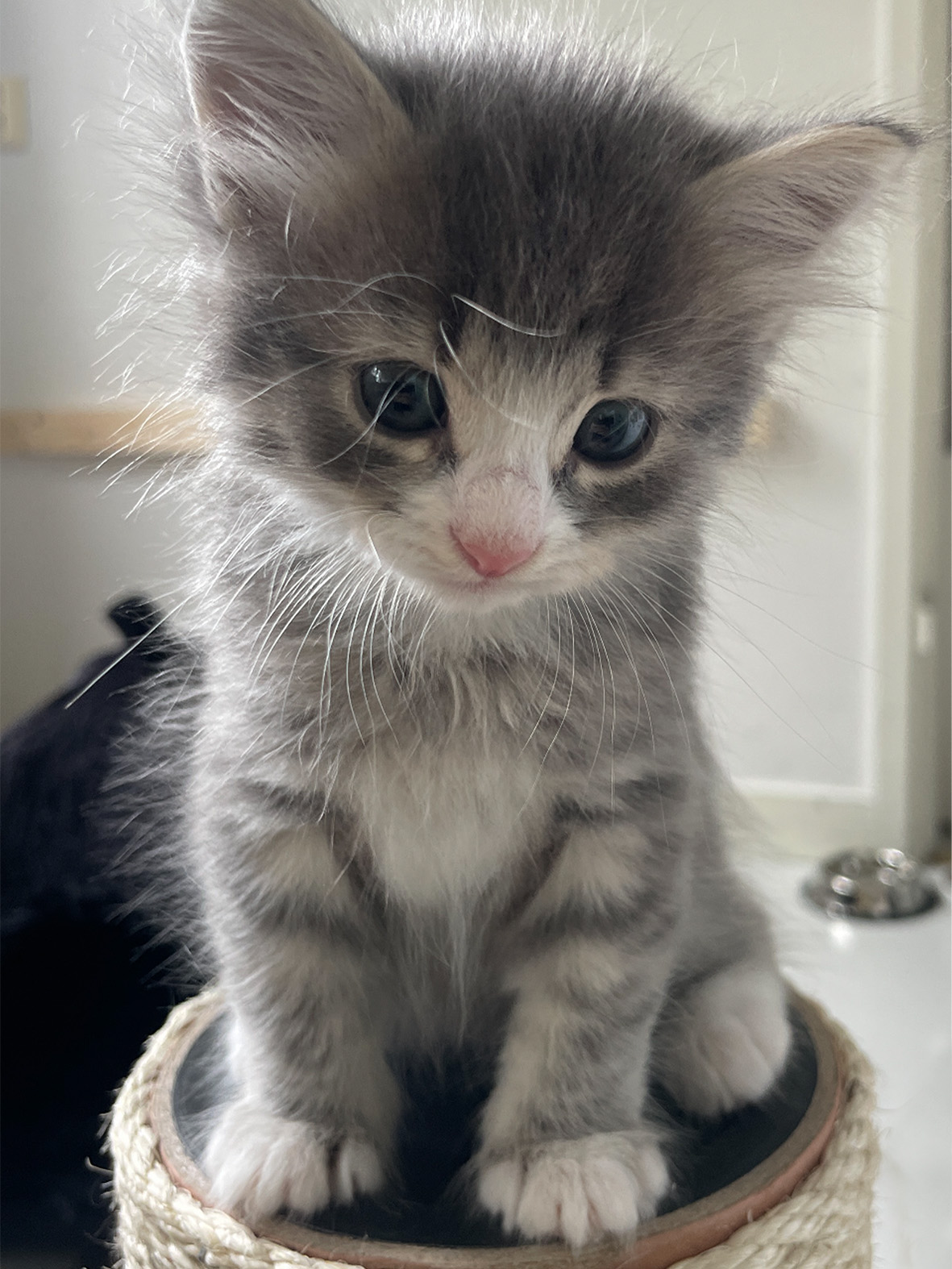 Nisse är en lugn eftertänksam katt. Han kan sitta och titta och ta det lugnt, gärna i knät. Han leker bra med den andra katterna och han gillar att klättra och är nyfiken.